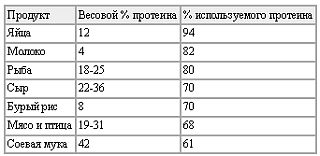 Можно видеть, к примеру, что яйца содержат лишь 12 % протеина, однако благодаря специфическому набору аминокислот 94 % этого протеина может использоваться организмом. С другой стороны, протеин составляет 42 % соевой муки, но его состав таков, что организм может использоваться лишь 61 % от этого количества. Итак, существует значительное различие между общим содержанием протеина и тем количеством, которое фактически используется организмом для роста мышечной ткани.
