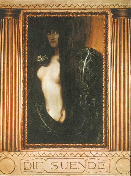 Представленное полотно — одно из самых известных произведений знаменитого немецкого художника-символиста Франца фон Штука. Его сюжет и символика одновременно просты и многозначны. Женщина со змеем, олицетворяющая грехи и человеческие пороки, написана в чрезвычайно темных тонах. Белым ярким пятном представлена ее нагота. Лицо героини неприятно-серого цвета, в ней сразу ощущается что-то порочное, взгляд одновременно спокоен, а из-за серого цвета настораживающе зол, демоничен. Живописец обыгрывает и библейский образ Евы. Очень характерным для большей части искусства символизма служит тот факт, что узнаваемый, хорошо прочитываемый символ и ассоциации воздействуют на зрителя с помощью художественных средств — колорита, композиции, усиливая общее впечатление. Показательно, что автор сам изготовил оригинальную, кричащую своим богатством с декадентским акцентом раму. Зрителю становится понятно, что грех прячется под яркими роскошными одеждами.