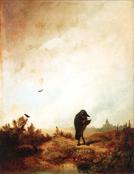 Популярный художник бидермейера, немец Карл Шпицвег отличался большим интересом к загадочным, но при этом ироничным сюжетам. Данный на первый взгляд прост — ворон изображен читающим книгу за городом. Это, пожалуй, самая популярная птица в искусстве — герой легенд, саг, историй, библейских сюжетов. Она — символ черной магии, несчастий и одновременно отменного ума и интеллекта. Особенно популярен образ ворона стал в первой половине XIX века благодаря поэтике немецкого романтизма. Всем известна любовь романтиков к загадочным, пугающим тайным силам черной магии, которые с тех пор пленили фантазию просвещенных европейцев. Таким образом, картина, при классически выписанном пейзаже, что проявилось в сдержанной темно-коричневой гамме, несет мистический оттенок. Похоже, что во времена Шпицвега она подошла бы для кабинета какого-нибудь состоятельного бюргера, не лишенного любви к искусству.