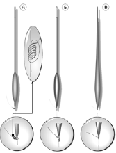 Для ловли в стоячей воде, где течение отсутствует, наиболее оптимальными следует признать поплавки удлиненной иглообразной формы, которые обеспечивают высокую чувствительность при поклевках. Ведь не зря поплавок «гусиное перо» еще востребован. Но тело поплавка иглообразной или веретенообразной (рис. 39) формы, максимально обеспечивающее чувствительность