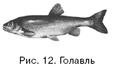 В благоприятных условиях голавль вырастает до больших размеров. По некоторым данным он достигает длины 80 см и веса до 8 кг. Голавль отличается от других рыб семейства карповых своим брусковатым телом и широколобой головой, которой он и обязан своим названием. У него крупная чешуя с легким золотистым оттенком, ярко-оранжевые грудные и брюшные плавники, а спинной и хвостовой – черной окраски (рис. 12).