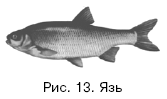 Язь, наряду с голавлем, обитает на равнинных реках с умеренным, реже быстрым течением. Он также относится к карповым и достигает веса 6–8 кг (рис. 13). Половая