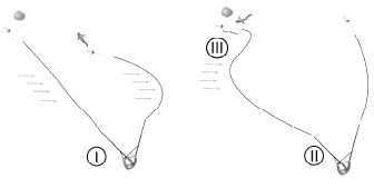 Возможно, лучшим вариантом будет заброс с изгибом шнура («Squiggle Cast») с немедленным последующим «Мending». Шнур расположится зигзагом и при поклевке будет перемещаться не весь, а только его дальняя, выпрямленная по течению часть (рис. 183, III).