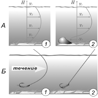 Поводок в процессе проводки нимфы должен быть выпрямленным (рис. 184, б, 2), чему способствуют специально утяжеленные мухи, вес которых содействует и более быстрому их погружению. При ловле на короткую нимфу привязываем две мушки, что позволяет использовать весьма мелкие имитации. Так как поводок располагается в воде под углом, длина его должна превышать глубину в месте ловли. Короткая дистанция и фиксация шнура над водой, кроме хорошего контакта с мухами, имеют еще одну положительную черту: незначительное сопротивление тонкой лески течению. Это дает возможность вести нимфу медленней скорости течения верхнего слоя толщи воды. Важность такой проводки становится понятной при анализе составляющих скорости течения (рис. 184, а). Самая большая скорость будет в середине толщи воды и на поверхности. Наименьшая скорость течения будет у дна. Разница эта особенно заметна в реке, изобилующей подводными преградами. За камнями и подъемами дна образуются завихрения воды или даже встречное течение. Проводка затопленных до самого дна мух со скоростью верхнего слоя воды приведет к неестественно быстрому их перемещению.