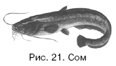 Сом обитает чаще у самого дна на больших глубинах. Спина его черная, бока несколько светлее с темными пятнами, брюхо белое с желтовато-грязным оттенком, отвислое. Тело в хвостовой части сжато с боков. Голова сома непропорционально огромна, составляет 1/6 всей длины. Огромная пасть вооружена мелкими зубами. Два длинных уса на верхней и четыре коротких уса на нижней челюсти дополняют облик этой рыбы. Тело обильно покрыто слизью (рис. 21).