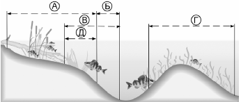 С началом гниения подводной растительности основная масса окуня отходит от берегов и располагается на чистых и еще не очень глубоких участках. Это песчаные косы, отмели у ям и бровок старых затопленных русел, иногда просто незначительные перепады глубины (рис. 220, д, г). Мелкий же окунь остается в зарослях камыша у берега.