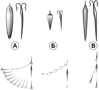 Рис. 221. Типы вертикальных блесен: А– щучья; Б – окуневая; В – судаковая