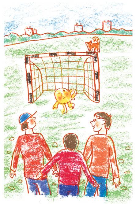 Колобок никогда еще не бывал в таком высоком доме, поэтому прыгать вниз по ступенькам оказалось невероятно весело. Он так разогнался, что пулей вылетел из подъезда во двор. Здесь, споткнувшись о камень, он кубарем покатился к мальчишкам, игравшим в футбол. Игра была в самом разгаре. Носившиеся по полю игроки ничего, кроме мяча и ворот соперника, не видели. И не мудрено, что, оказавшись под ногами футболистов, Колобок тут же получил увесистый пинок.