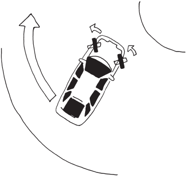 Задняя ось скользит к внешней кромке поворота. Колеса выворачиваются в сторону заноса. Прибавление газа увеличивает угол заноса. Средства борьбы с заносом: