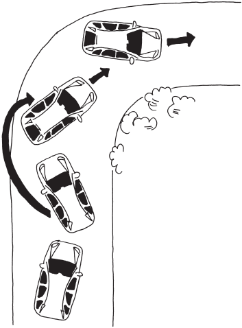 Передние колеса переднеприводного автомобиля в управляемом скольжении должны смотреть в ту сторону, куда должен ехать автомобиль, а не в сторону заноса, как на заднеприводном. Движение рулем в сторону начинающегося заноса в его начальной фазе будет абсолютно оправданным – так и надо поступать! Когда автомобиль сориентирован в сторону поворота, можно решительно прибавлять газ, «вытягивая» машину из скольжения в прямолинейное движение (рис. 46).