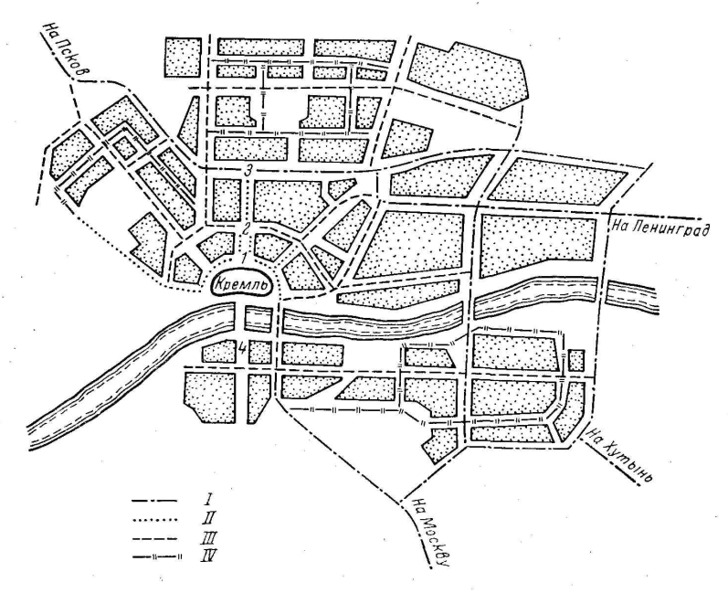 Для пропуска основных потоков автомобильного и коммунального транспорта запроектированы магистральные улицы общегородского назначения: продольная (магистральная улица, пересекающая город с юга на север, отходящая от Псковского шоссе через вновь намечаемые жилые районы, далее вдоль внешней стороны земляного вала с выходом на Ленинградское шоссе; на Торговой стороне - проспект В. И. Ленина; магистраль, связывающая Торговую и Софийскую стороны, проходящая по проспекту Гагарина, через мост, по Дмитриевской улице с выходом на Ленинградское шоссе; дополнительный выход от городского центра к проектируемому мосту через реку Волхов и в юго-западном направлении на основную продольную магистраль; связь Завокзального района с центром по Нехинскому шоссе и с северным промышленным районом - по Григоровскому шоссе.