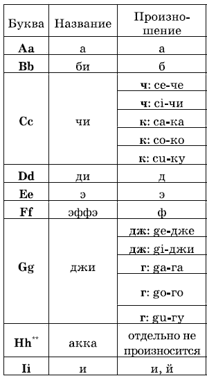 ** Служит орфоргафическим знаком для зрительного различения некоторых форм глагола avere (ho, hai, ha, hanno). В соединении с буквами с и g указывает на произношение их как к и г перед e и i: che=ке,chi=ки, ghe=ге, ghi=ги. Употребляется также в заимствованиях.