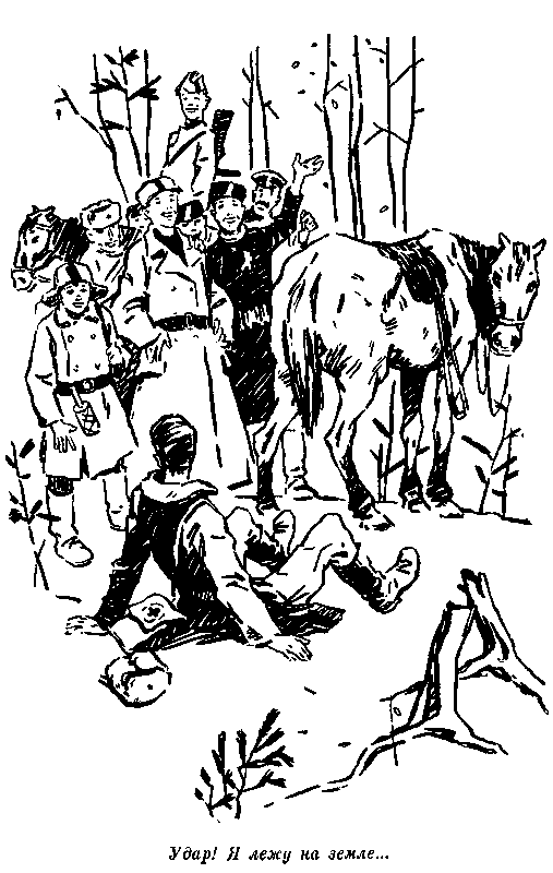 Черный суетится, заправляет мои ноги в брезентовые стремена, с поклоном подает ивовый прутик. Беру его в левую руку, перекладываю в правую. Потом чувствую, что начинаю вместе с седлом медленно сползать набок. В отчаянии хватаюсь за веревочные поводья и вдруг… ветер свищет у меня в ушах, кусты то взлетают, то проваливаются. Меня трясет, швыряет во все стороны. За что-то хватаюсь, что-то кричу. Лес наползает на небо, все темнеет. Во рту клочья лошадиной шерсти, и перед глазами надо мной лошадиное брюхо - вместе с седлом я перевернулся и вишу под лошадью.