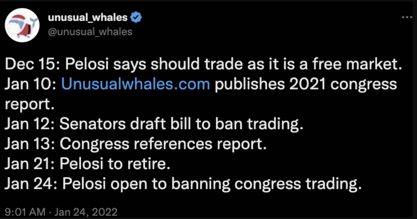 Мы заставили спикера Нэнси Пелоси отказаться от беспечности и веры в то, что Конгресс может продолжать торговать акциями в 2021 г., и стать сторонником запрета этой практики (Серьезно, она была против законопроектов до привлечения общественного давления, говоря, что «это свободный рынок»).