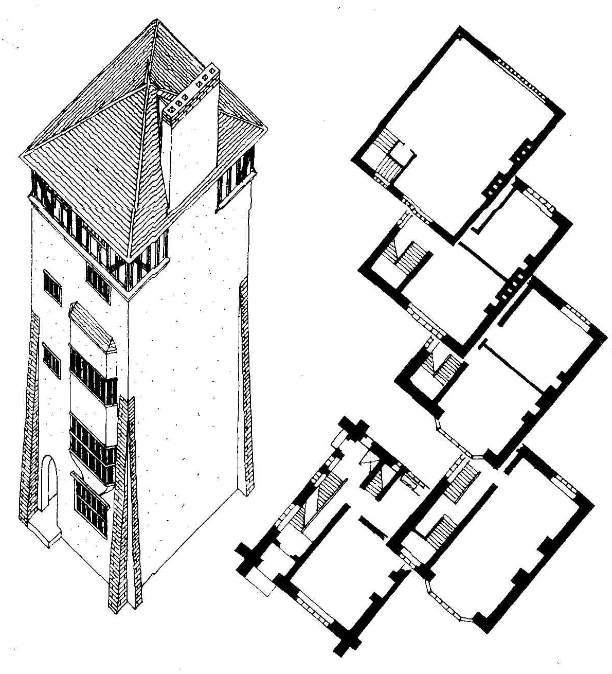 Войзи, всю жизнь руководствовавшийся принципом «нельзя добиться слишком большой простоты», воплотил этот принцип и в этом проекте: структура первых четырех этажей (снизу вверх на рисунке) идентична - появляется или исчезает поперечная перегородка. Первый этаж занят кладовой и кухней, второй - гостиной (4,3x9,2 м), третий и четвертый - спальнями (ванная комната и туалет - на третьем, за лестницей), пятый, почти свободный, если не считать поворотного марша лестницы, - проектной мастерской.