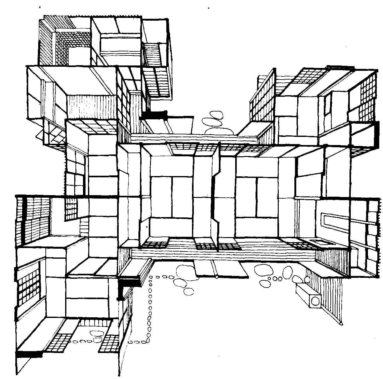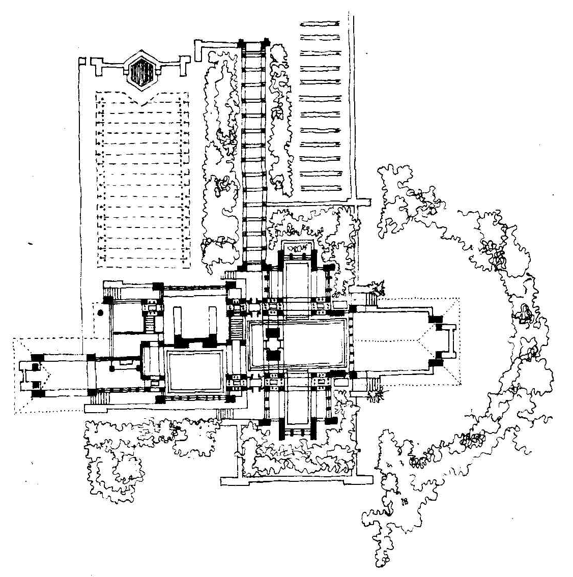 28. Ф. Л. Райт. (1869 - 1959). Мартин-хауз. Буффало, штат Нью-Йорк. 1904 год. План Франк Ллойд Райт, один из самых знаменитых архитекторов XX века, всегда отрицал, будто японская традиция жилого дома оказала на его творчество сколько-нибудь принципиальное влияние, однако это не так. Другое дело, что эта традиция сыграла для Райта лишь роль катализатора, помогла созреванию его оригинальной философии жилища и глубоко персонального художественного стиля. Мартин-хауз - один из лучших среди ряда так называемых домов прерий, выстроенных Райтом в начале нашего столетия близ Чикаго и других городов американского северо-востока. Райт назвал эти подчеркнуто горизонтальные, распластанные по земле дома «домами прерий», хотя все они строились в пригородах больших городов, подчеркивая названием ведущий для себя принцип - слияние с окружающим ландшафтом.