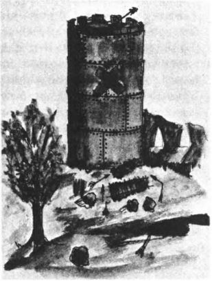 Атаки уже значительно повредили стены, но башня укреплена железными листами. Одно место, где стрела проникла внутрь башни, покрыто пересекающимися полосами скрепляющего бандажа. (Это двойственный символ, поскольку он одновременно обозначает часть первоначальной травматической сцены — красный крест на маленьком ящике аптечки первой помощи, висящем на стене в ванной комнате.)