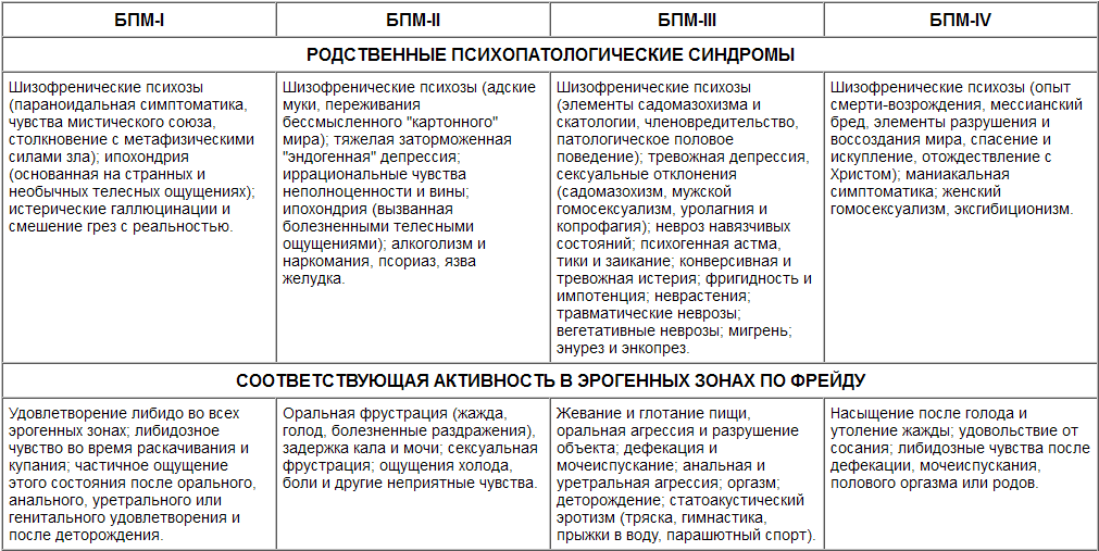 В отношении фрейдовских эрогенных зон эта матрица на всех эволюционных уровнях отвечает состоянию удовлетворенности, сопровождающему активность, благодаря которой разрядилось или снизилось напряжение. На оральном уровне — это утоление жажды и голода (или прекращение сильной тошноты после рвоты), удовольствие от сосания или от разжевывания пищи; на анальном уровне — чувство удовлетворения, сопровождающее дефекацию, а на уретральном — облегчение, вызванное опорожнением мочевого пузыря. Соответствующим феноменом на генитальном уровне является релаксация, наступающая сразу после оргазма; у женщин это также удовольствие, связанное с деторождением.