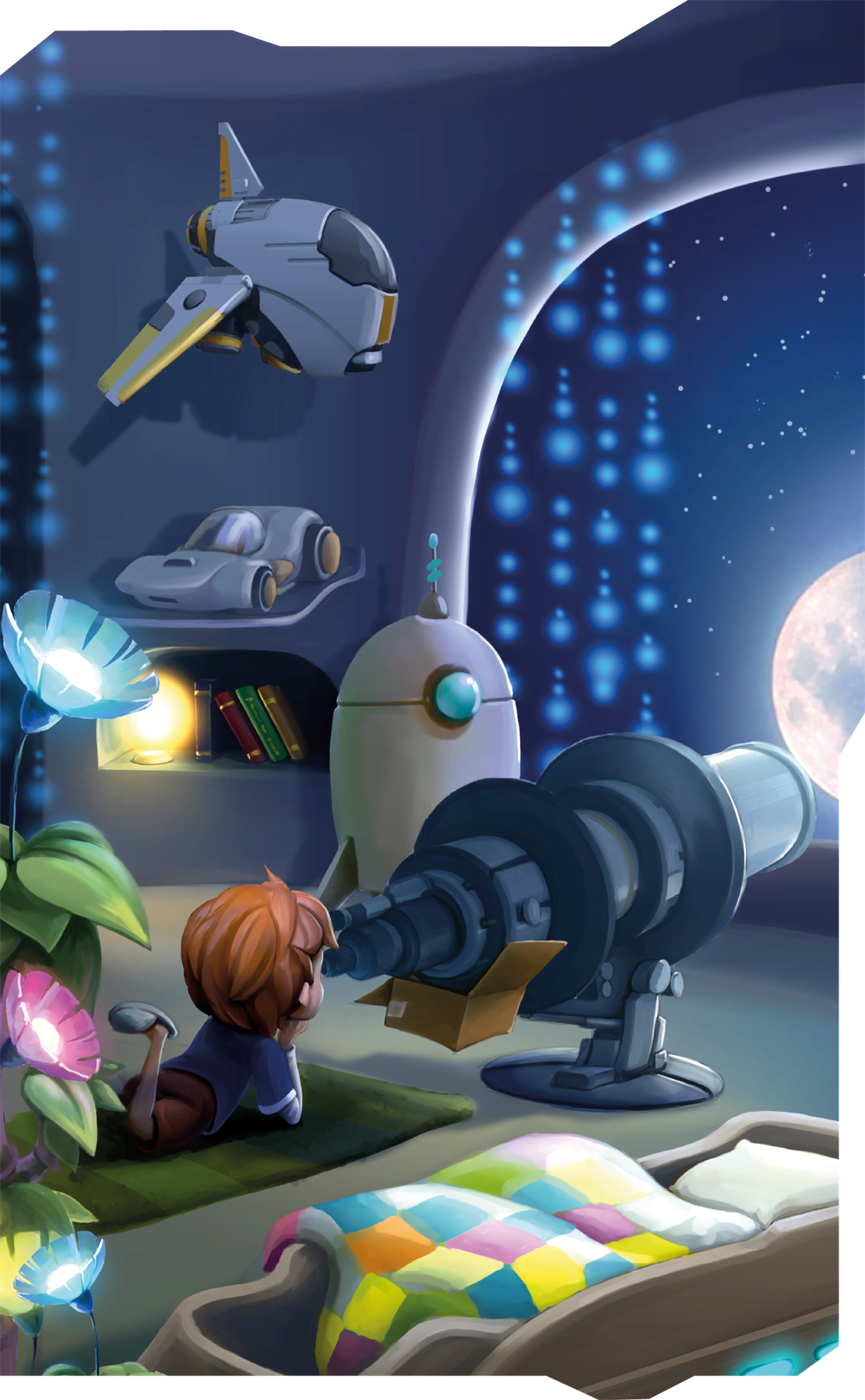 Один весёлый солнечный луч дотянулся до окна на последнем этаже, где не были опущены нанопластиковые жалюзи, и, хихикая, заглянул в просторную комнату, где на полках вдоль всех стен стояли игрушечные роботы и модели космических кораблей. Одну из стен целиком занимала проекционная панель учебно-игрового компьютера, а у окна расположился большой телескоп, почти такой же, как в настоящей обсерватории. Правда, к нему кто-то прикрутил нанокартонный конус, выглядевший как-то совсем несолидно.