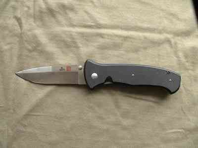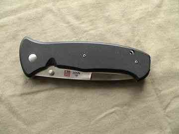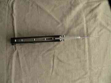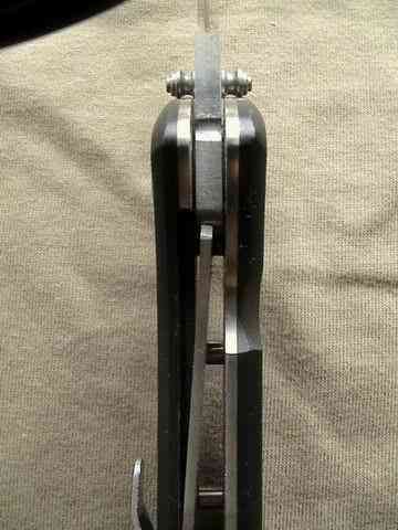 Замок: лайнерного типа, интерфреймлок, т. е., пластина замка является одним целым с плашкой рукояти. Толщина пластины около 1.5 мм., поэтому для облегчения открывания замка, у основания пластины сделан продольный прорез и ее толщина в этом месте снижена до миллиметра. Из всех ножей, прошедших через мои руки, лайнер на «двухтысячном» получает первое место, сильно обгоняя даже прославленный лайнер на Милитари.