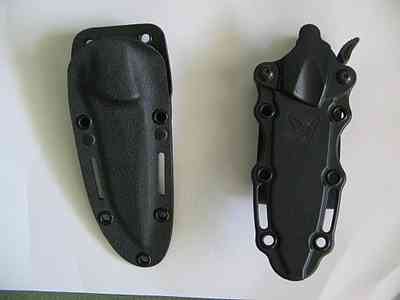 На «вертиге» ножны намного проще, и считаю, удобнее. Они из кайдекса с отверстием для слива воды. Рукоятка ножа плотно фиксируется в ножнах за счет обжатия ее кайдексом ножен. Никаких дополнительных «хитровыдумленных» замков нет. То же самое и с креплением на пояс. Крепление сделано тоже из одной пластины кайдекса таким образом, чтобы нож было можно носить на поясе и вертикально и горизонтально.