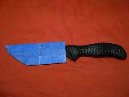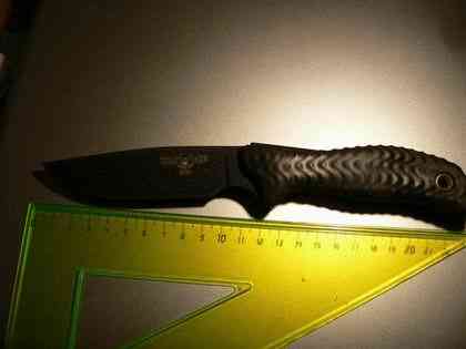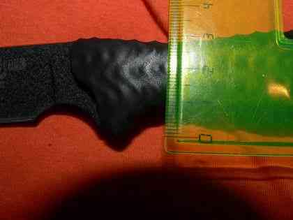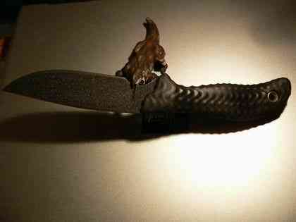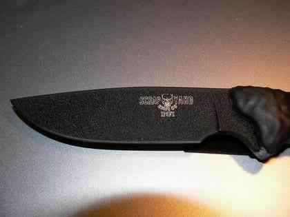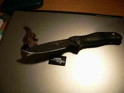 Клинок имеет черное покрытие, причем обух не покрыт им. Многие пользователи снимают покрытие, полируя клинок. Заточка из коробки на 3 — режет, но не бреет. Пришлось заточить до бритья волос. На водяных камнях. РК выведена не симметрично, так называемый Convex edge. Применяют его не часто, такой край позволяет лучше сносить удары. Угол примерно 40 градусов при подводах к РК толщиной 0,7–0,8мм. Имеет здоровый чойл, который позволяет класть на него палец и лучше контролировать клинок при деликатном резе.