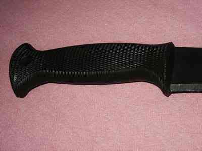 Пластик рукояти конечно не G10. Более скользкий, но не совсем. Форма ее — хорошее сочетание легкости и небольшой ширины с ухватистостью. Легкий изгиб сзади позволяет сделать уверенный упор в ладонь при колющем приложении силы, в то же время она достаточно прямая для удобства оперирования различными хватами. Не толстая и не широкая — но ухватистая. Уверенности хвата добавляют небольшие, ненавязчивые подпальцевые выемки.