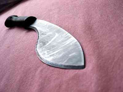 Рикассо (чоил?) не имеет специальной полукруглой формы, как на Чинуках и Маниксах, а обух — насечек, но упор и хват для силового реза (частично за лезвие) возможен из-за расширяющейся геометрии лезвия от пяты — выступа над отверстием и внизу у пяты. Правда надо быть аккуратным — не вести разрез движением вперед — все-таки обух скользкий, а указательный палец — нужный элемент