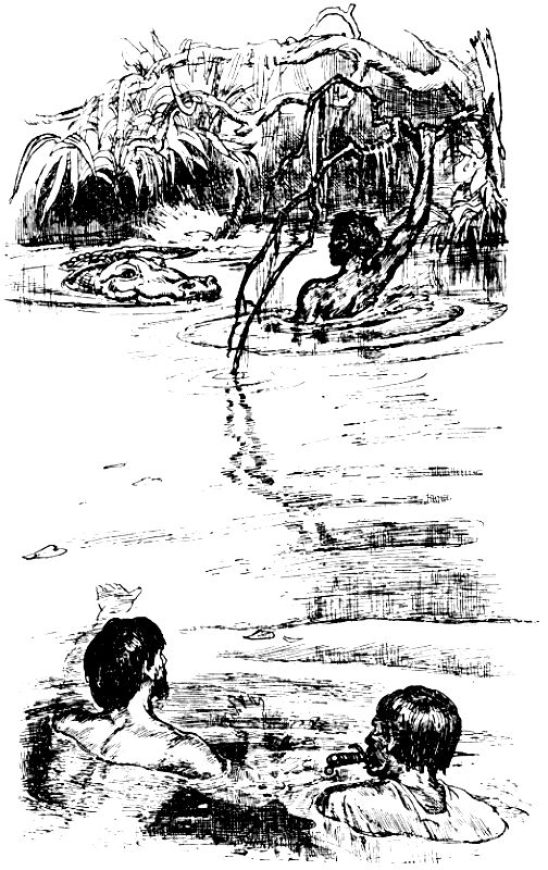 Развязка приближалась, но не такая, какой мы ожидали. Ни зрители, ни преследователи и не догадывались, чем кончится погоня. Даже сам мулат не подозревал, какая новая страшная опасность ему грозила. Тень деревьев на берегу острова уже падала на пловца, и каждую минуту мы ждали, что он скроется в ней. Но вдруг он круто повернул и поплыл вдоль берега.