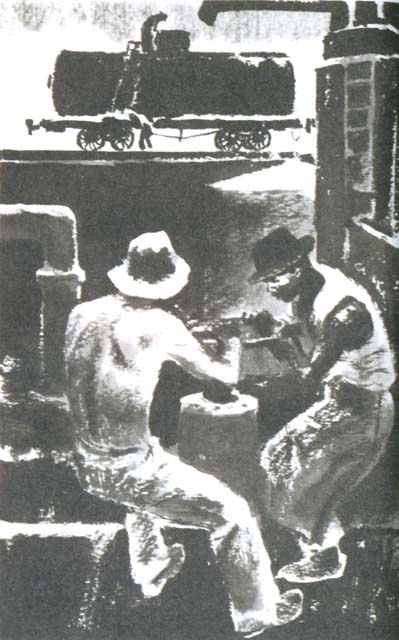 Однако картина будет неполной, если, помимо жилищ, не описать работу на заводах — работу нудную, грязную, безрадостную, ничего не дающую ни уму, ни сердцу, ибо это процесс чисто механический, один и тот же изо дня в день, без намека на творчество: наполнять нефтью чаны; прибавлять в чан определенное количество разных химических веществ, способствующих очистке нефти; открывать и закрывать краны, чтобы нефть переливалась по трубам из одного чана в другой и, наконец, попадала в бочки и в баки, которые погрузят на автомобили или пароходы. Как все это делается, вы прочтете в любой энциклопедии.
