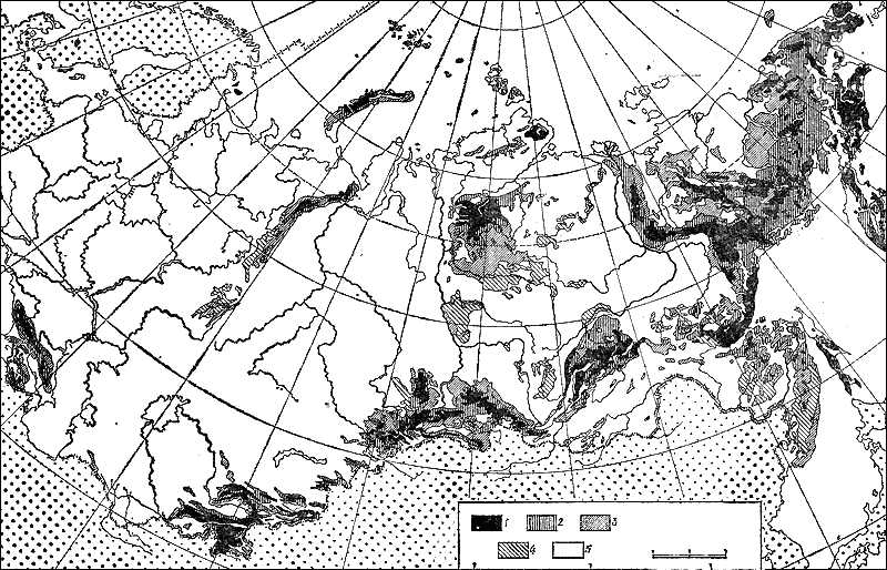 1 — районы со значительной лавинной опасностью (лавины встречаются часто, сходят ежегодно); 2 — районы со средней лавинной опасностью (сеть лавин разрежена, лавины сходят не ежегодно); 3 — районы со слабой лавинной опасностью (лавины встречаются в отдельных местах, сходят в многоснежные годы); 4 — районы с потенциальной лавинной опасностью (в настоящее время безопасны); 5 — нелавиноопасные районы.