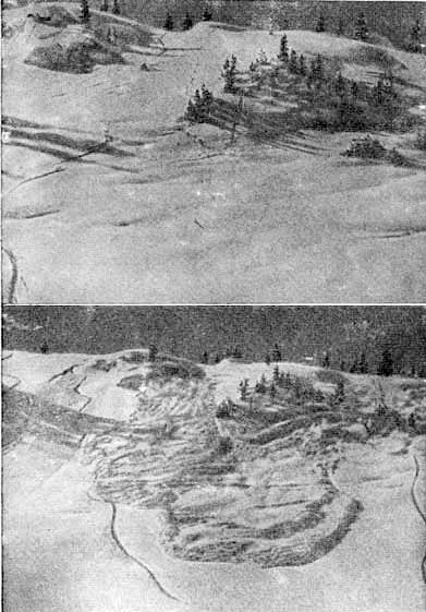 Здесь, казалось бы, есть все признаки расчетливой недоброжелательности, как в игре кошки с мышью. Однако лавинщик скажет, что, по-видимому, они катались по твердой снежной доске, лежавшей на мощном слое глубинной изморози. Действие их веса ослабляло доску, как и подрезание ее лыжами. Снежная доска и без того уже была в напряженном состоянии из-за оседания и сползания снега. При внезапном падении температуры — а это обычно происходит в высокогорье при заходе солнца — доска начала сжиматься. Напряжение увеличилось настолько, что она стала разламываться.