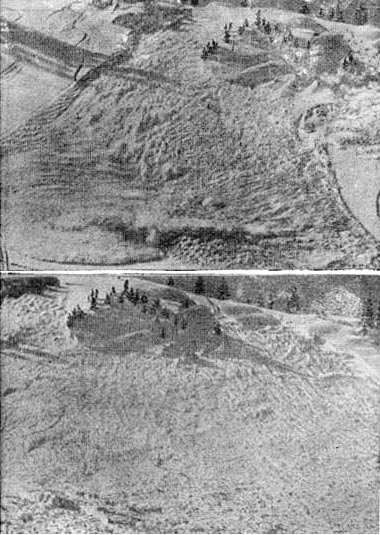 Ля-Шапелль захвачен лавиной на Перуанском хребте. Заметьте его продвижение вместе с лавиной по склону (начиная с верхнего левого угла на первой фотографии).