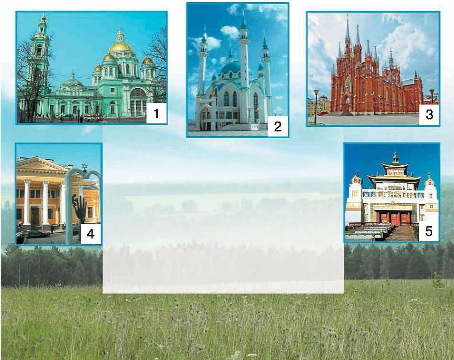 1 – православный Богоявленский собор. Москва; 2 – мечеть Кул Шариф. Казань; 3 – римско-католический храм. Москва; 4 – Большая хоральная синагога. Москва; 5 – буддистский храм. Элиста