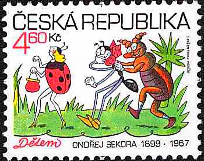 Муравей Ферда, жук Пытлик и божья коровка Берушка. Чешская юбилейная марка 1999 года, выпущенная к 100-летию со дня рождения Ондржея Секоры