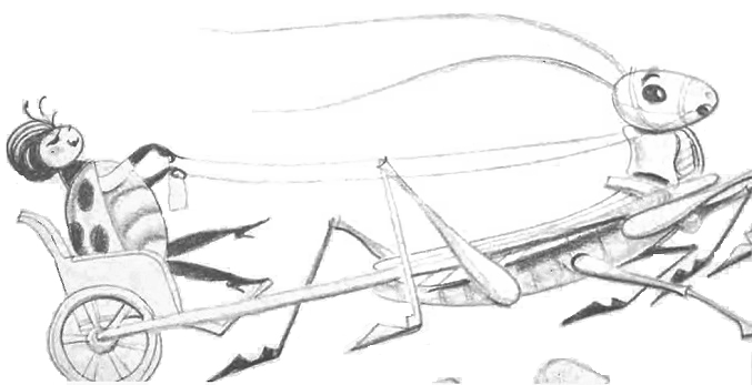 Как только Ферда заметил, что кузнечик его любит, он стал запрягать и учить кузнечика возить коляску. Ах, как это было чудесно!
