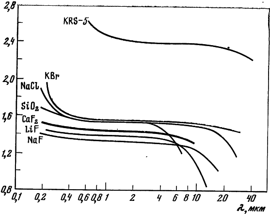 Рис. 1. Зависимость показателя преломления (n) от длины волны для флюорита и ряда других кристаллических материалов