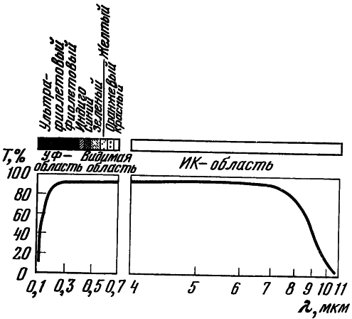Особенно важным свойством флюорита является его высокая прозрачность в широком спектральном диапазоне: от 0,125 мкм в вакуумной ультрафиолетовой (УФ) (шумановской) до 11 мкм в инфракрасной (ИК) областях спектра (рис. 2). На рис. 3 приведены сравнительные данные о диапазонах пропускания. Среди различных оптических материалов нет ни одного, для которого так удачно, как для флюорита, сочетались бы оптические характеристики. Только немногие искусственные кристаллы имеют более коротковолновую границу пропускания — это кристаллы фтористого лития LiF, фтористого магния MgF2, дигидрофосфата аммония NH4H2PO4(ADP). Но они либо имеют двойное лучепреломление, либо характеризуются низкой твердостью, либо водо- и кислотонеустойчивы (табл. 1), что ограничивает их применение в оптическом приборостроении. Ряд материалов, имеющих в ИК-области более длинноволновую границу пропускания, чем у фтористого кальция, уступают ему по пропусканию в УФ-диапазоне и могут использоваться исключительно в спектральных приборах для ИК-области. Это бромистый калий KBr, бромистый цезий CsBr, йодистый калий KI, KRS-5 (состава TlBr — TlI).