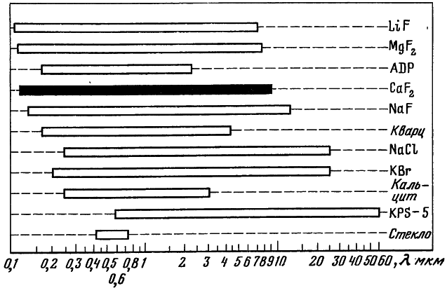 Рис. 3. Границы спектрального пропускания различных оптических материалов