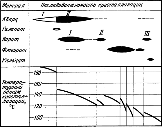 По данным минералогенетических реконструкций (рис. 13) [Ермаков, 1944], месторождение формировалось в интервале температур 90—200° С, наиболее обычные температуры кристаллизации оптического флюорита около 120° С (интервал 100—140° С). Барит более высокотемпературный — 140° С (интервал 120—195° С), кальцит относительно низкотемпературный — 100° С (интервал 90-110° С).