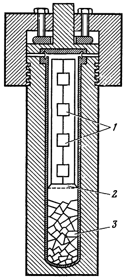 1 — затравки для выращиваемых кристаллов; 2 — диафрагма; 3 — шихта (дробленый флюорит)