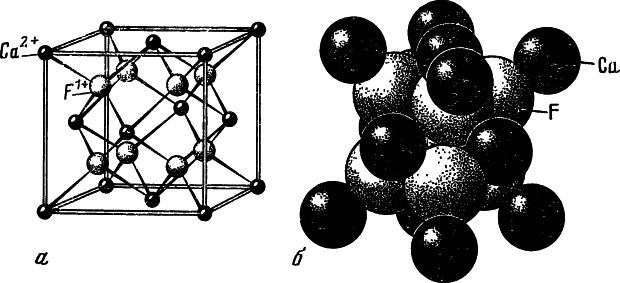 Элементарная ячейка флюорита представляет собой куб, разделенный на восемь маленьких кубиков — октантов. Ионы кальция (Ca2+) располагаются по вершинам большого куба и по центрам каждой из его граней, а ионы фтора (F– ) — в центрах каждого октанта. Каждый ион фтора оказывается, таким образом, окруженным четырьмя ионами кальция (FCa4), располагающимися по вершинам тетраэдра, который называется координационным, а каждый ион кальция находится внутри координационности куба, образованного восемью ионами фтора (CaF8).