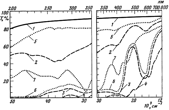 1 — типичная кривая пропускания необлученных кристаллов; 2—4 — пропускание кристаллов после -облучения с дозой 5 Мрад (окраска: 2 — голубая, 3 — синяя, 4 — бурая); 5—7 — пропускание облученных кристаллов после нагревания при t = 100° С в течение 1 ч (окраска: 5 — голубая, 6 — синяя, 7 — бурая)