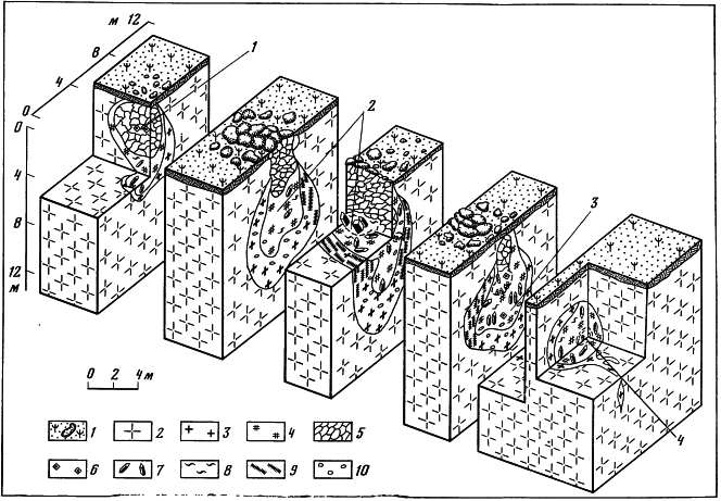 Камерные флюоритоносные пегматиты связаны пространственно и генетически с гранитоидами. Они известны в Казахстане, Восточной Сибири, на Урале, Украине [Самсонов, Савельев, 1980]. Пегматитовые тела с флюоритом имеют изометричную каравае-, трубо- и жилообразную форму. Они характеризуются многозональным строением (рис. 12). От периферии к центру выделяются зоны: аплитовидная -> графическая -> пегматоидная -> кварцевое ядро -> камера (погреб). Флюорит вместе с крупными и гигантскими кристаллами кварца покрывает стенки полостей (камер, погребов), которые локализуются в пегматоидной зоне под кварцевым ядром или сбоку от него.