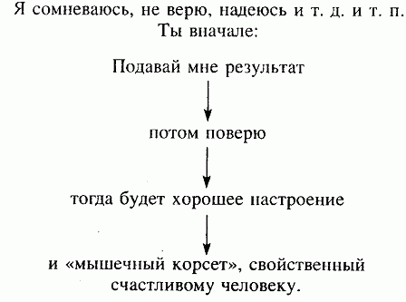 Эффект получен, вера появляется, потом настроение улучшается и, естественно, «мышечный корсет» (осанка и мимика) будет как у победителя. Лицо становится довольным, сияет улыбкой. А пока рыло умное совковой лопаткой: «Сомневаюсь!» Подавай ему нормальный задний проход без геморроя. Вот схема поведения типичного несчастливца.