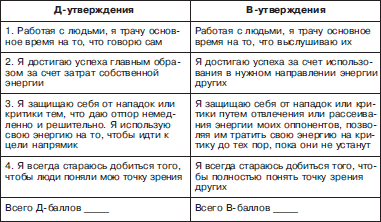 Если ваши оценки по одному из видов утверждений выше этих средних оценок, это можно расценить как свидетельство вашей большой склонности либо к «жесткому стилю» руководства (в случае более высокой суммы по Д-утверждениям), либо к повышенной податливости к воздействиям извне (в случае более высокой суммы по В-утверждениям).