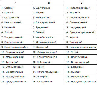 Вам предлагается список из 30 строк, по 3 слова в каждой строке. В каждой строке выбирете только одно из трех слов, которое наиболее точно вас характеризует, и отметьте его.