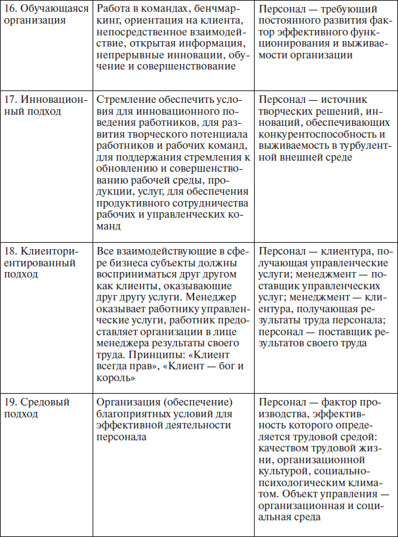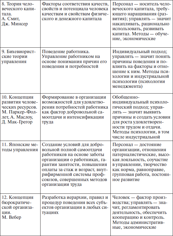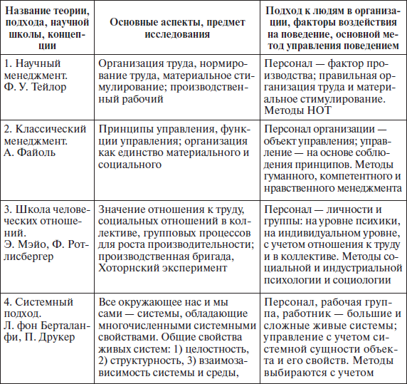 Для иллюстрации многообразия и изобилия доказавших свою эффективность подходов, научных концепций, школ в области менеджмента, объясняющих поведение людей в организации, приведем в табл. 1.1 краткие характеристики некоторых из них.