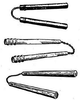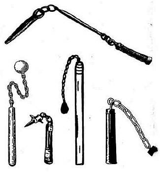 НУНТЯКУ. Гораздо большее распространение, чем цепы традиционного образца, получили сегодня нунтяку — (в уличном жаргоне «нунчаки» или «нончака»). Нунтяку состоит их двух коротких круглых или многогранных палок равной длины, соединенных веревкой или цепью.