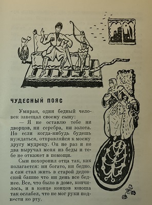 – Пока ты жил в моей башне, вокруг выросли такие дремучие леса, что и не проберешься - дороги не найдешь. Вот тебе пояс. Подпояшься - и откроется дорога в черном лесу. Когда выедешь из леса на равнину, увидишь медную башню и рядом с ней железную гостевую комнату. Остановишься в гостевой. Выйдет к тебе хозяйка башни, красавица девушка. Множество юношей приезжали к ней, сватались, но ни один не вернулся обратно. Когда она выходит к гостю, то не разговаривает с ним. Но если гость заставит ее три раза заговорить, если у него найдется столько ума, она выйдет за него замуж, и ему достанутся все ее сокровища и башня. Когда она выйдет, ты положи пояс на фынг и скажи: «Видно, хозяйка моя немая, не о чем говорить с ней. Расскажи ты, мой барсовый пояс, что делается на свете». Пояс расскажет три были и каждый раз будет задавать тебе вопросы, а ты давай нарочно неверные ответы. Если девушка заговорит с тобой - твое счастье; не то велит отрубить тебе голову и насадить ее на ограду башни.